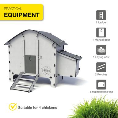 🚪 Incl. ladder, 1 manual door, 1 laying nest, 2 perches, maintenance flap (rear)