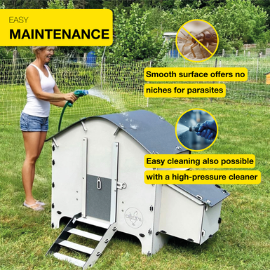 Unlike wooden hutches, the Harmony can be easily cleaned with water - even with a pressure washer! No hidden corners for mites, no time-consuming maintenance. A plus point for your chickens and your free time.