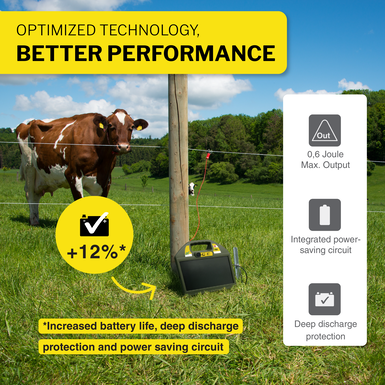 The 3-stage LED display "Energy Control" offers a quick check of the battery capacity and also shows the activity of the energiser by flashing in time with the pulse output. The special energy-saving circuit automatically adapts the energy consumption to the electric fence - for less power consumption and lower operating costs.
