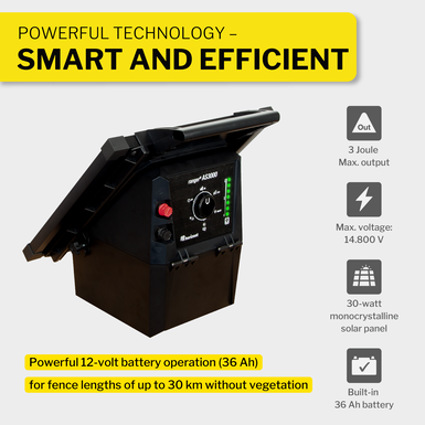 The ranger® AS3000 is a reliable solution for both mobile and stationary electric fences. Featuring a 30-watt monocrystalline solar panel, 12 V battery operation, and 3 joules of output energy, it ensures high fence voltage and maximum containment safety—even under demanding conditions.