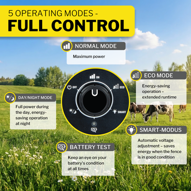 Flexibly adjustable to animal type, fence length, vegetation, and season—always the right mode.