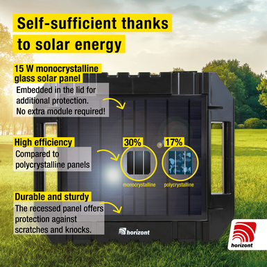 The 15 watt monocrystalline glass solar module embedded in the case lid makes the appliance independent of power sources and saves energy. Glass increases longevity (compared to plastic) - the smooth surface prevents the formation of moss and other soiling - and the monocrystalline module also offers significantly higher efficiency compared to polycrystalline modules.