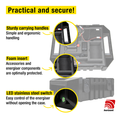The case system offers space for accessories, including an optional 230V power supply unit, which can also be used to operate the device from the mains. A second battery can also be added to the case, allowing you to double the running time of your device.