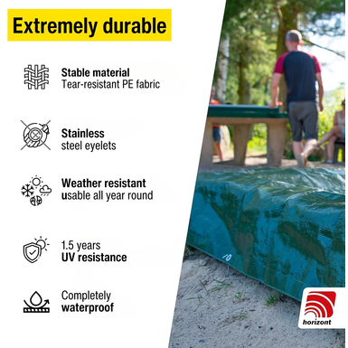 Made from robust 140 g/m² PE material, the tarpaulin is not only waterproof and mould-resistant, but also UV-stabilised and offers 1.5 years of UV resistance. This ensures long-lasting protection, even in the harshest weather conditions.