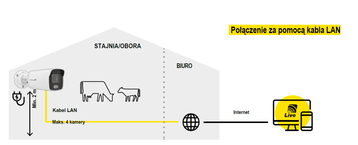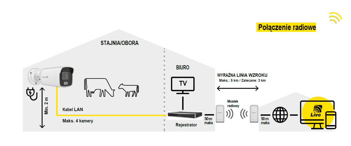 Jeśli biuro nie jest zintegrowane z budynkiem stajni, odległość do 5 km (musi być zapewniona widoczność) można pokonać za pomocą rozwiązania radiowego. Potrzebne są do tego dwa urządzenia mostkowe.