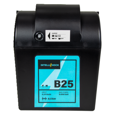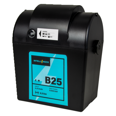 IntelliShock B25 to klasyczne urządzenie zasilane bateryjnie, ale jako dwufunkcyjny zasilacz do ogrodzeń elektrycznych ma również inne opcje zasilania ogrodzenia elektrycznego optymalną mocą. Poza zasilaniem bateryjnym, urządzenie może być zasilane z sieci lub akumulatora. Dwufunkcyjne zasilacze ogrodzeń elektrycznych mogą być jednocześnie podłączone do zasilania sieciowego 230 V i akumulatora 12 V lub baterii 9 V. W przypadku awarii zasilania sieciowego gwarantowana jest nieprzerwana praca przy użyciu akumulatora lub baterii. Opcjonalnie ogrodzenie elektryczne może być również zasilane za pomocą panelu słonecznego. Użytkownik ma możliwość wyboru sposobu i miejsca korzystania z urządzenia IntelliShock.