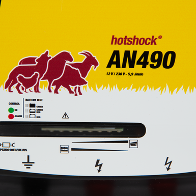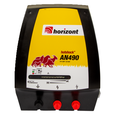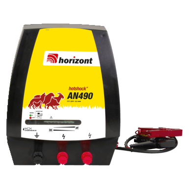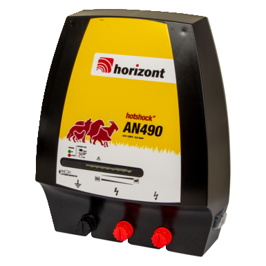 Potężny zasilacz ogrodzenia elektrycznego hotshock® AN490 dla rolników - najlepsze narzędzie do obrony silnych zwierząt i bezpiecznego trzymania zwierząt długowłosych i pierzastych.
