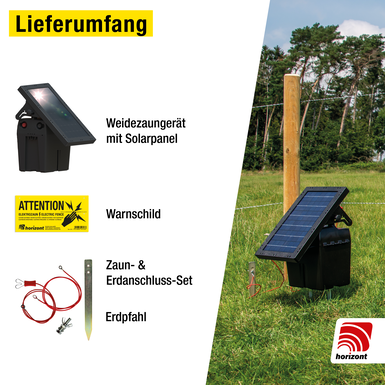 Kompletny zestaw do łatwej instalacji: Zakres dostawy obejmuje elektryzator, panel słoneczny o mocy 5 W, kołek uziemiający, kable do podłączenia ogrodzenia i uziemienia, znak ostrzegawczy, instrukcję obsługi i instrukcje bezpieczeństwa. Oznacza to, że możesz natychmiast skonfigurować shockstar S40 i zapewnić bezpieczeństwo swoim zwierzętom.