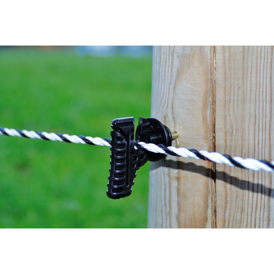 Combi 40 doskonale sprawdza się jako izolator liniowy, a także jako izolator początkowy i narożny. Dzięki zintegrowanemu drewnianemu gwintowi na stabilnym wsporniku o grubości 6 mm, można go szybko i bezpiecznie zamocować na palikach drewnianych lub recyklingowych. Montaż jest prosty i efektywny, co pozwala zaoszczędzić cenny czas i skupić się na podstawowych zadaniach.