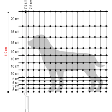 Siatka strongLine o wysokości 110 cm i długości 25 m ma wysokiej jakości podwójne kolce oraz wzmocnione górne i dolne sploty, co zapewnia dodatkową wytrzymałość. Wyjątkową odporność na rozdarcia i trwałość zapewnia 12 poziomych plastikowych żyłek z przyspawanymi punktami węzłowymi, które dzięki swojej jakości gwarantują wysoki poziom bezpieczeństwa. Dolna część ogrodzenia mobilnego jest szczególnie gęsto ułożona, aby zapobiec ucieczce małych i młodych zwierząt z ogrodzonego obszaru.