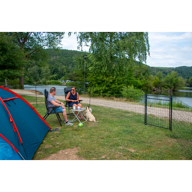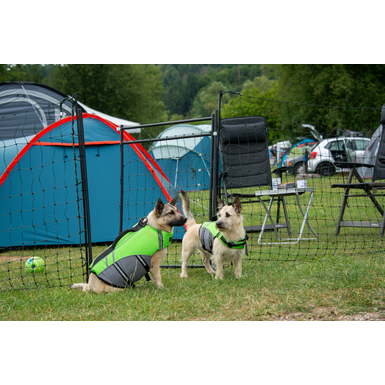 Zmniejsza to odległość między słupkami z 4,17 m do 3,13 m i zapobiega zwisaniu, które często występuje w przypadku zwykłych ogrodzeń dla psów - więcej słupków oznacza mniejszą odległość, co pomaga zoptymalizować napięcie siatki. Dzięki zwiększonej stabilności słupków ogrodzenie dla psów można szybko i bez użycia narzędzi zamontować i zdemontować. Dzięki nowemu materiałowi słupki nie wyginają się nawet pod dużym naciskiem. Regularne przenoszenie ogrodzenia nie stanowi więc problemu.