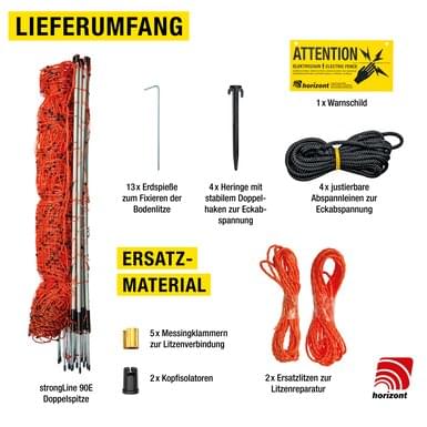 Różne kolory izolatorów słupków na początku siatki ułatwiają montaż i zapobiegają plątaniu się ogrodzenia. Siatka strongLine jest również wyposażona w solidne klipsy ze stali nierdzewnej, które ułatwiają łączenie siatek bez użycia narzędzi i ruchomych części.