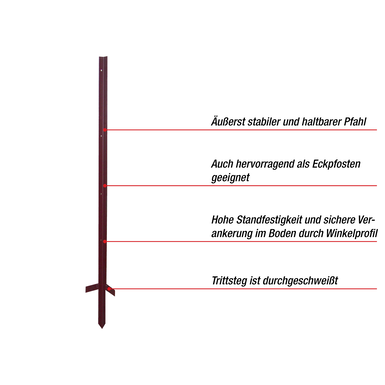 Zaprojektowany jako coś więcej niż tylko słupek, ten stalowy słupek kątowy jest wszechstronny. Dzięki czterem otworom na strategicznych wysokościach około 20 cm, 40 cm, 65 cm i 95 cm oferuje elastyczne opcje mocowania izolatorów. Można je przymocować za pomocą gwintu metrycznego lub jako izolatory zaciskowe. Jego specjalna konstrukcja sprawia, że jest nie tylko idealny do prostych odcinków, ale także bezkonkurencyjny jako słupek narożny.