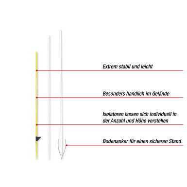 Indywidualnie regulowane izolatory: Dostosuj izolatory do swoich potrzeb. Liczbę i wysokość izolatorów można indywidualnie dostosować do wymagań pastwiska.