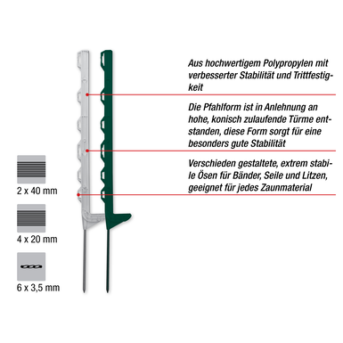 Wzmocniona i zaokrąglona nóżka z karbowaniem zapewnia pewny chwyt i zapobiega przypadkowemu poślizgowi podczas wbijania palika. Stabilne zaczepy o różnym designie sprawiają, że palik jest niezwykle wszechstronny, idealny do różnych taśm lub linek do ogrodzeń pastwiskowych. Dwa izolatory na szczycie palika umożliwiają pełne wykorzystanie jego długości. Numerowane zaczepy znacznie ułatwiają montaż ogrodzenia, szczególnie na dużych pastwiskach.