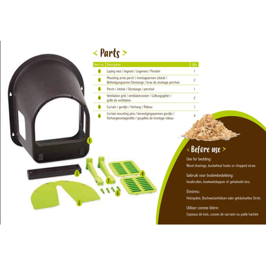 Zalecamy stosowanie wiórów drewnianych lub łuski gryczanej dla optymalnej ochrony jaj. Jedno gniazdo zapewnia miejsce dla maksymalnie 5 kur.