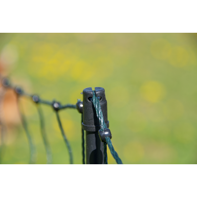 Ale nie tylko nowe słupki z włókna szklanego, wzmocnione górne i dolne pasma, wysokiej jakości podwójne kolce i wąskie odstępy między oczkami sprawiają, że siatka dla kurcząt strongLine jest produktem premium. Zintegrowany ogranicznik gruntu również ulepsza ogrodzenie, utrzymuje siatkę stale na ziemi i zapobiega wczołgiwaniu się pod nią zwierząt. Ponadto, każdy słupek posiada izolator głowicy, który bezpiecznie prowadzi górne pasmo, nawet przy wietrze i pogodzie, zapewniając w ten sposób niezbędną wytrzymałość na rozciąganie, a także bezpieczeństwo stada i stabilne oparcie.