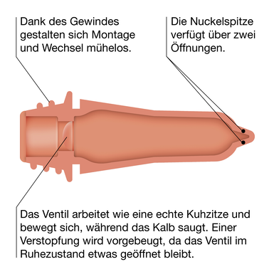 Smoczek Peach Teat, ceniony za swoją naturalność, charakteryzuje się tym, że nie przepuszcza więcej płynu niż wymię krowy, dzięki czemu cielę może ssać bardziej energicznie niż w przypadku tradycyjnych smoczków. Stymuluje to przepływ śliny i poprawia wartość pH w żołądku, co z kolei wspomaga trawienie. Smoczki zachęcają do naturalnego ssania z optymalnym przepływem mleka.